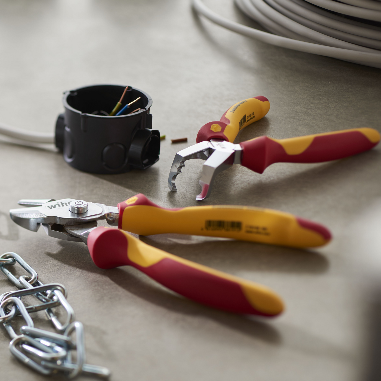 Precise, safe work – at double the power: no problem for the Wiha BiCut® Professional electric diagonal cutters. If standard performance from heavy-duty diagonal cutters is no longer enough, force can be doubled at the simple press of a button. In normal mode, the BiCut® effortlessly cuts items such as cables or iron nails. A patented joint design transforms the heavy-duty diagonal cutters into high-performance diagonal cutters for extremely hard and stronger materials. This function is not only suitable for cutting exceptionally tough materials but also for users who need to carry out normal cutting tasks over a longer period of time. Thanks to double cutting force, the user only needs to apply half the hand force, ensuring work is easy on muscles and tendons. This significantly reduces the risk of cramp or slipping if too much force is applied. The backs of the handles also feature an extra wide design while the integrated soft and hard zones on the handles are ideally tailored to the human hand. The high-performance diagonal cutters are manufactured as per the international IEC 60900 standard and are thus approved for working on live parts up to 1,000 V AC.