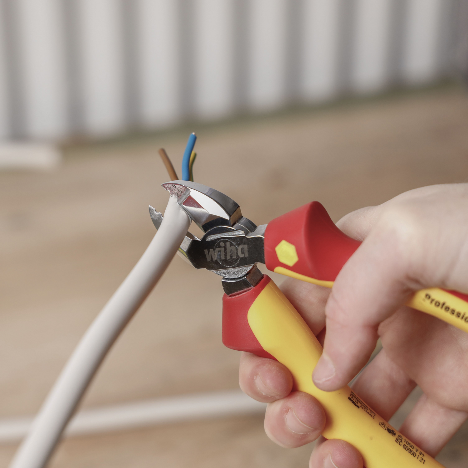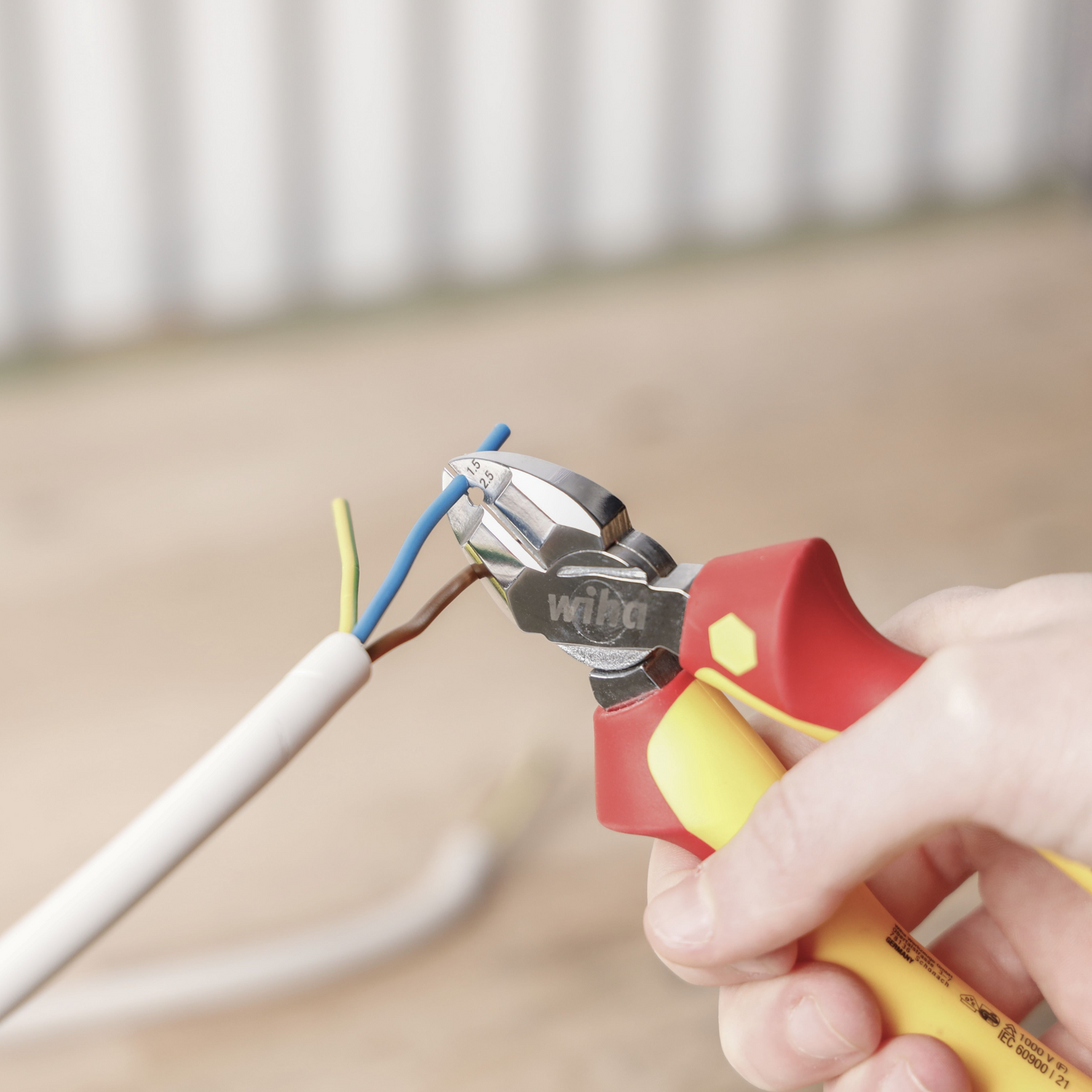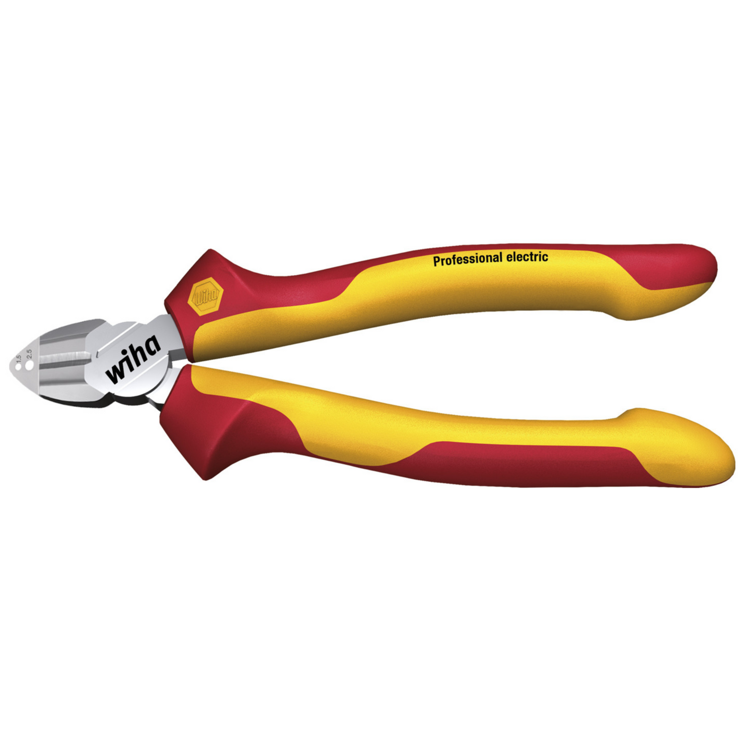 Low wear lap joint, riveted and able to withstand high loads.The Wiha DynamicJoint® ensures optimal transmission of hand strength to the cutting edges.Lightweight action, clean cutting achieved by specially milled precision cutting edges.Long term cutting is achieved through additional inductive hardening to approx. 64 HRC.Rear cutting area near to plier joint also suitable for medium-hard and hard wire.Front cutting area for soft wire, with precision stripping stations for 1.5 mm² and 2.5 mm² single-wire conductor.