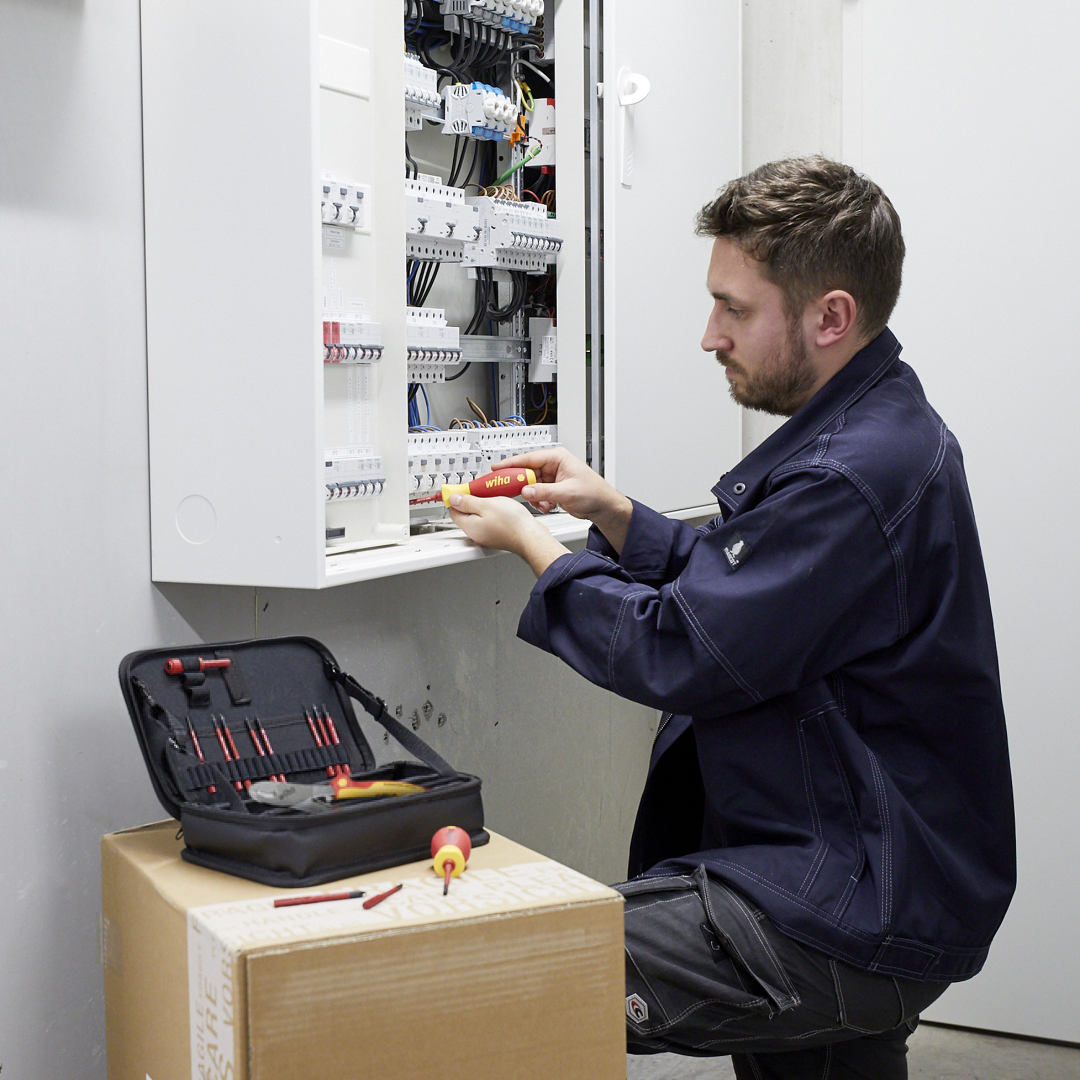 The mounting and installation of wallboxes require special qualifications from the employees as well as safe, certified equipment. With the tool set, the user always has the right tool at hand. Safely stored and tidy in a robust multifunctional bag, these electrician's tools are perfectly suited for mobile use. As holder of a design patent, the bag from Wiha inspires with its multifunctional usability. When unfolded, it functions as a work bench stand for easy retrieval of the tools. The strap for hanging the bag on the wall and the removable base provide additional value. With its versatile interchangeable bit system, the tool set offers optimum space saving. Thanks to Wiha slimTechnology, the included slimBit blades are up to 33% slimmer and can thus easily reach low-lying screw and spring elements. In combination with the extra-short Stubby handle, screws can be effortlessly reached, even in confined spaces. The set contents can be used in a variety of ways, so you will always find the right tool, even when working at a distribution cabinet. Each tool in the set has undergone individual piece testing as per international IEC 60900 standard, allowing users to work safely on live parts up to 1,000 V AC.