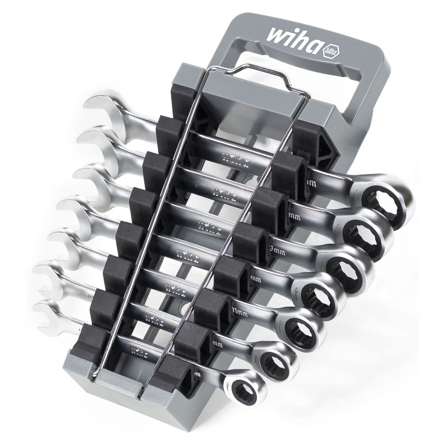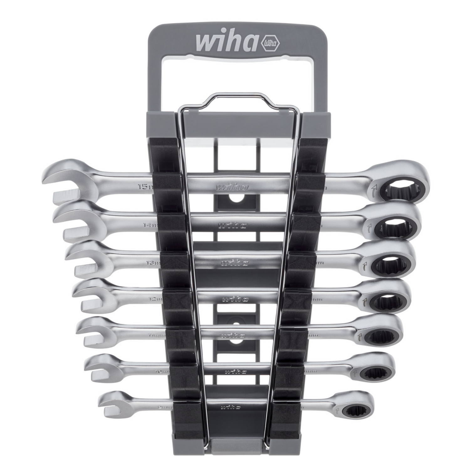 Opening tightly fastened screws requires great force. With the leverage action from Wiha's ring ratchet open-ended spanner, the user can easily open any fastening. The jaw end is also excellently suited for tightening screws and nuts. With 15° jaw positioning, the jaw end is perfect for working in confined spaces. Similarly, when working with the ring ratchet, the user benefits from the double hex design and the fine toothing with 72 teeth, offering a short return angle and highest comfort when working in confined spaces. By simply turning around its own axis, it can be switched between right and left rotation. Made of high quality chrome vanadium steel, the ring ratchet open-end spanners are distinguished by their longevity and robustness, not the least thanks to their corrosion-resistant and easy to clean surface. The set includes the 7 most commonly used sizes from 9 to 15 mm, neatly stored in a convenient holder. The holder can be opened with a single hand to remove the appropriate size.The non-slip surface finish ensures a strong grip, even in oily or wet work situations.