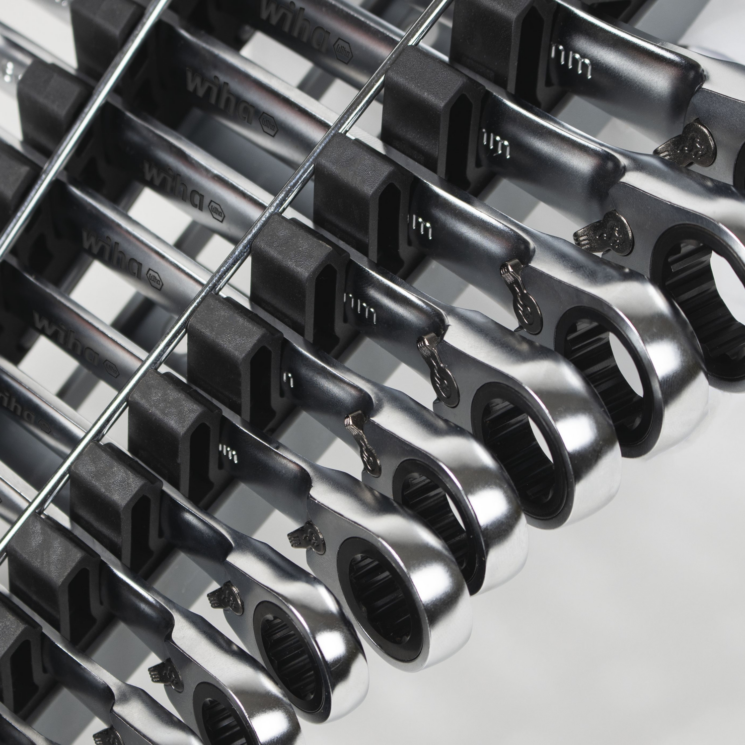 Opening tightly fastened screws requires great force. With the leverage action from Wiha's ring ratchet open-ended spanner, the user can easily open any fastening. The jaw end is also excellently suited for tightening screws and nuts. With 15° jaw positioning, the jaw end is perfect for working in confined spaces. Similarly, when working with the ring ratchet, the user benefits from the fine toothing with 72 teeth, offering a short return angle and highest comfort when working in confined spaces due to the double hex design. The right or left rotation can be variably adjusted by the integrated switching lever. Made of high quality chrome vanadium steel, the ring ratchet open-end spanners are distinguished by their longevity and robustness, not the least thanks to their corrosion-resistant and easy to clean surface. The set includes the 12 most commonly used sizes from 8 to 19 mm, neatly stored in a convenient holder. The holder can be opened with a single hand to remove the appropriate size. The non-slip surface finish ensures a strong grip, even in oily or wet work situations.