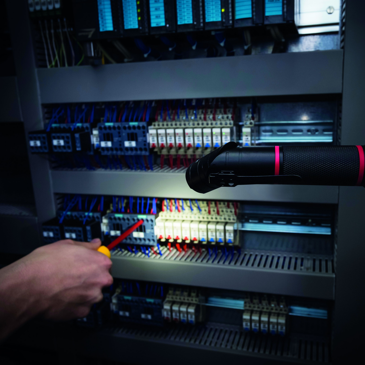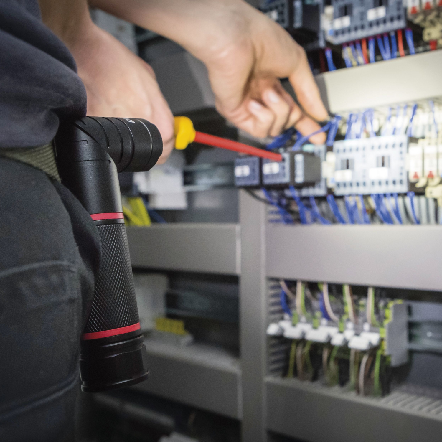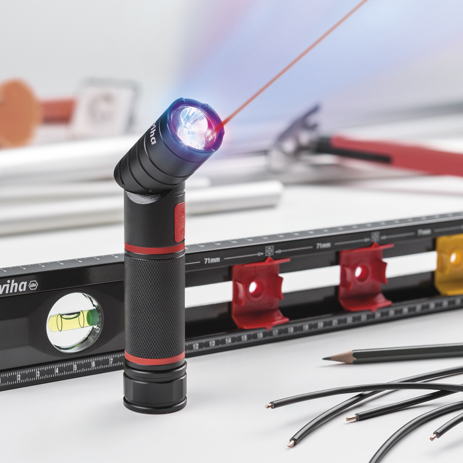 The multi-functional flashlight sheds light on things in three ways. A universal work tool, it features an integrated laser, UV light and LED light. The LED light function provides two lighting levels, which allow you to adjust the flashlight to specific light conditions, thus improving your field of vision. The practical retaining clip and the magnetic positioning mechanism free your hands for other tasks. Thanks to the integrated magnets, this flashlight can also be positioned as required in most electrical enclosures. The lamp head also swivels into a L-shape, enabling the user to point the light source in the direction required for the task at hand. The integrated laser makes it easier to fix positions more precisely and project measurements when installing lights on the ceiling, for example. A delayed switch-on interval of 2 seconds prevents the laser being activated accidentally. This flashlight is also eminently suitable for technical inspections thanks to its integrated UV light.
