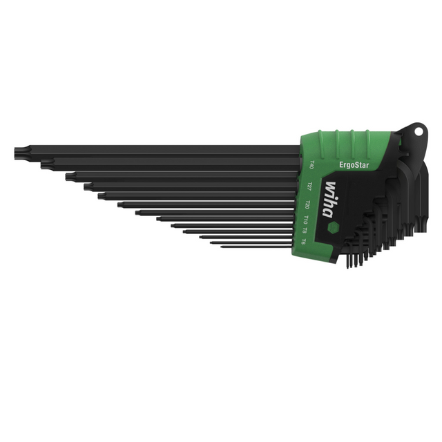 It's a common experience. It's not easy to remove individual keys from many L-key holders or place them back in the holder again. With Wiha ErgoStar, you can now say goodbye to such problems as it eliminates them in an ingenious way. Turning one L-key in the holder makes all other keys turn to the side at the same angle, enabling you to remove the key you need quickly and comfortably. A clamping mechanism in the holder makes sure that the keys cannot fall out, regardless of whether the holder is open or closed. Thanks to the MagicSpring® holding feature with its spring steel ring, the L-keys hold all TORX® screws firmly in any position perfectly without *the need of magnets. The set contains thirteen black-oxidised TORX® L-keys in standard sizes. The hanging bracket on the holder allows users to hang the L-key set up directly at their workstation.