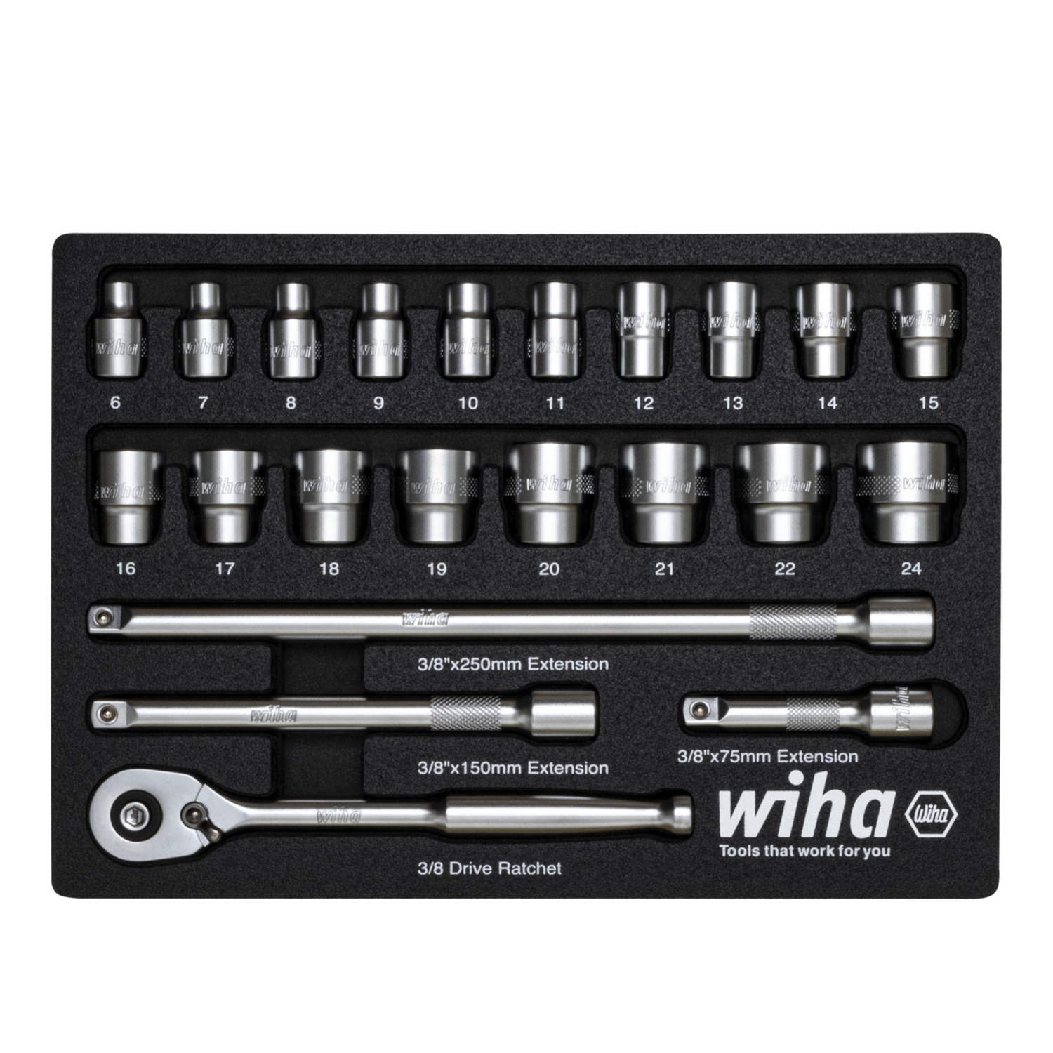 Opening tightly fastened screws requires great force. With the nut driver inserts from Wiha the user can easily open any fastening. Every user is excellently equipped with the set consisting of the 18 most popular 3/8" nut driver inserts size 6-24 mm, a ratchet wrench, and three extensions. The included ratchet wrench combined with the selection of nut drivers gives users the required flexibility for their work. When working with the ratchet wrench, the user benefits from the fine toothing with 72 teeth, offering a short return angle. The right or left rotation can be variably adjusted by the integrated switching lever. The combination with the included extensions allow them to conveniently reach deep-set screws and nuts. The nut driver and extensions are mechanically locked. The change is initiated by pressing the activation button. Made of high quality chrome vanadium steel, the nut driver inserts are distinguished by their longevity and robustness, not the least thanks to their corrosion-resistant and easy to clean surface. The entire contents of the set are neatly and clearly stored in a foam insert in which markings help find the suitable nut driver.