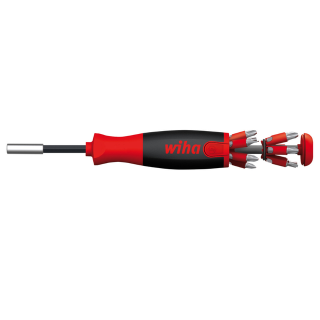 It's not uncommon for tradesmen out on jobs to need a screwdriver with a specific profile but not have the precise one within reach when they need it. The Wiha screwdriver with the LiftUp 25 bit magazine puts an end to such problems, because with only one tool you have 12 different drives at hand anytime, anywhere. LiftUp thus replaces an entire screwdriver set. At the press of a button, the bit magazine at the handle end comes out, delivering the 25 mm bits with a 1/4" drive ready for removal. The contained standard bits can be used for both manual and machine operation. Thanks to its large volume, the ergonomically shaped two-component handle ensures optimum power transmission and maximum torque values. Powerful screw fastening or loosening is therefore particularly easy for the hand.