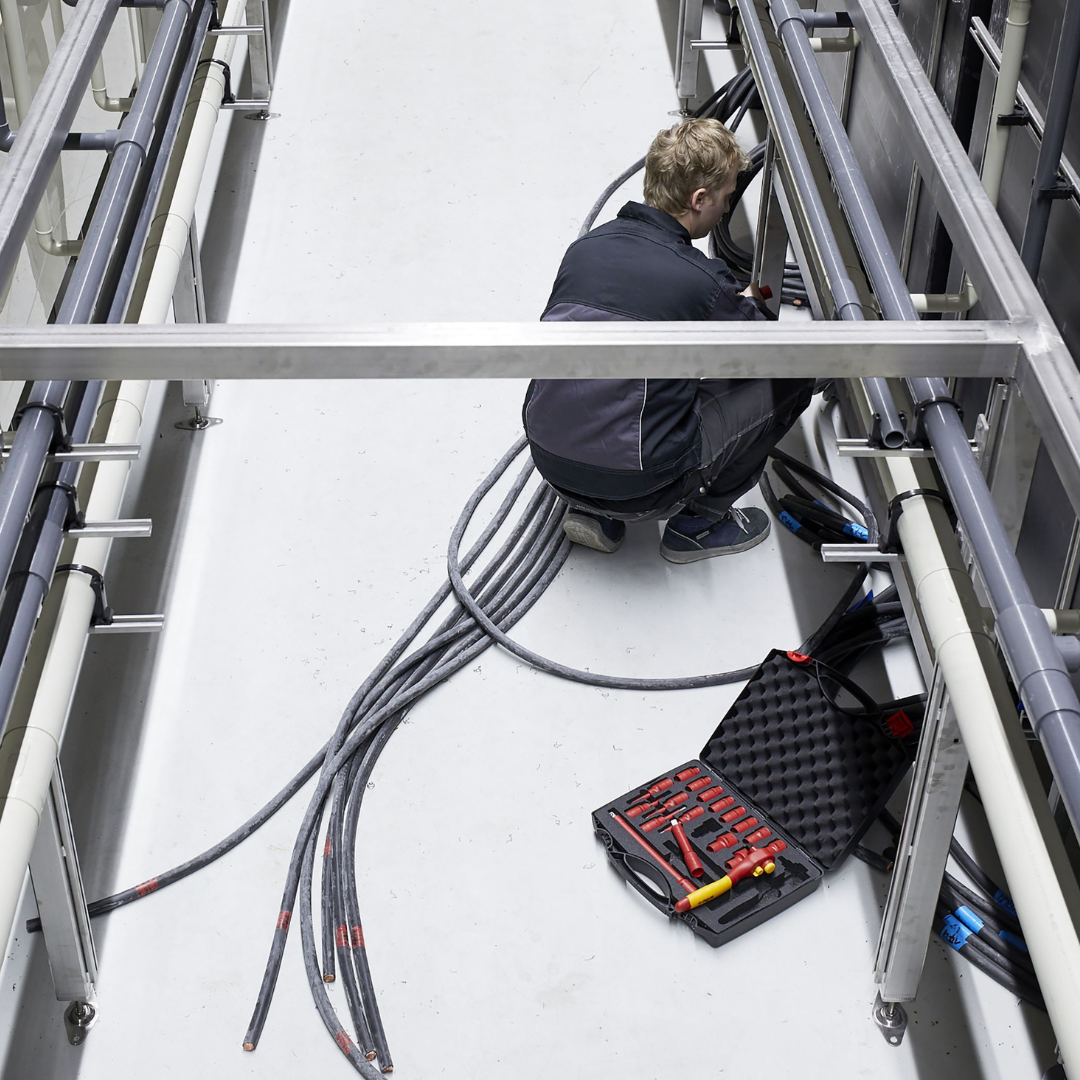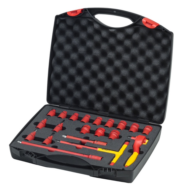 The Wiha Insulated 3/8in Ratchet Wrench Set is for safe installation of terminals and sleeves, conductor connections and fastening of conductor lines. Nut driver and extensions are mechanically locked, the change is initiated by pressing the activation button once. Each tool in the set is subject to an individual piece testing, as per the international IEC 60900 standard, allowing users to work safely on live parts up to 1,000 V AC. Organised and neatly stored in a practical and sturdy case.
