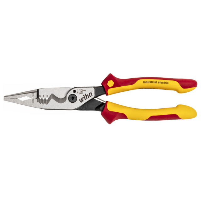 Suitable for bending eyelets or deburring plastic components, gripping and holding flat and rounded materials, opening and loosening hex screws and nuts, cutting of copper or aluminium cables, stripping, crimping, and shortening of tool screws.